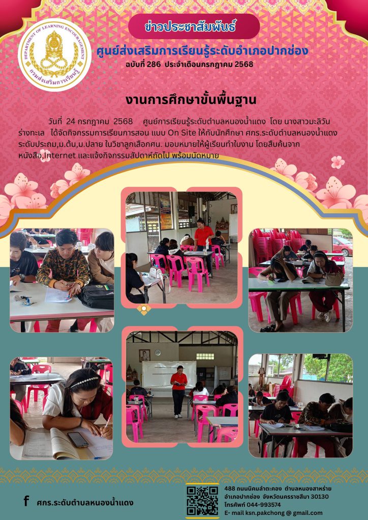 ศูนย์การเรียนรู้ระดับตำบลหนองน้ำแดง โดย นางสาวมะลิวัน ร่างทะเล ได้จัดกิจกรรมการเรียนการสอน แบบ On Site ให้กับนักศึกษา ศกร.ระดับตำบลหนองน้ำแดง ระดับประถม,ม.ต้น,ม.ปลาย ในวิชาลูกเสือ กศน. มอบหมายให้ผู้เรียนทำใบงาน โดยสืบค้นจากหนังสือ,Internet และแจ้งกิจกรรมสัปดาห์ถัดไป พร้อมนัดหมาย