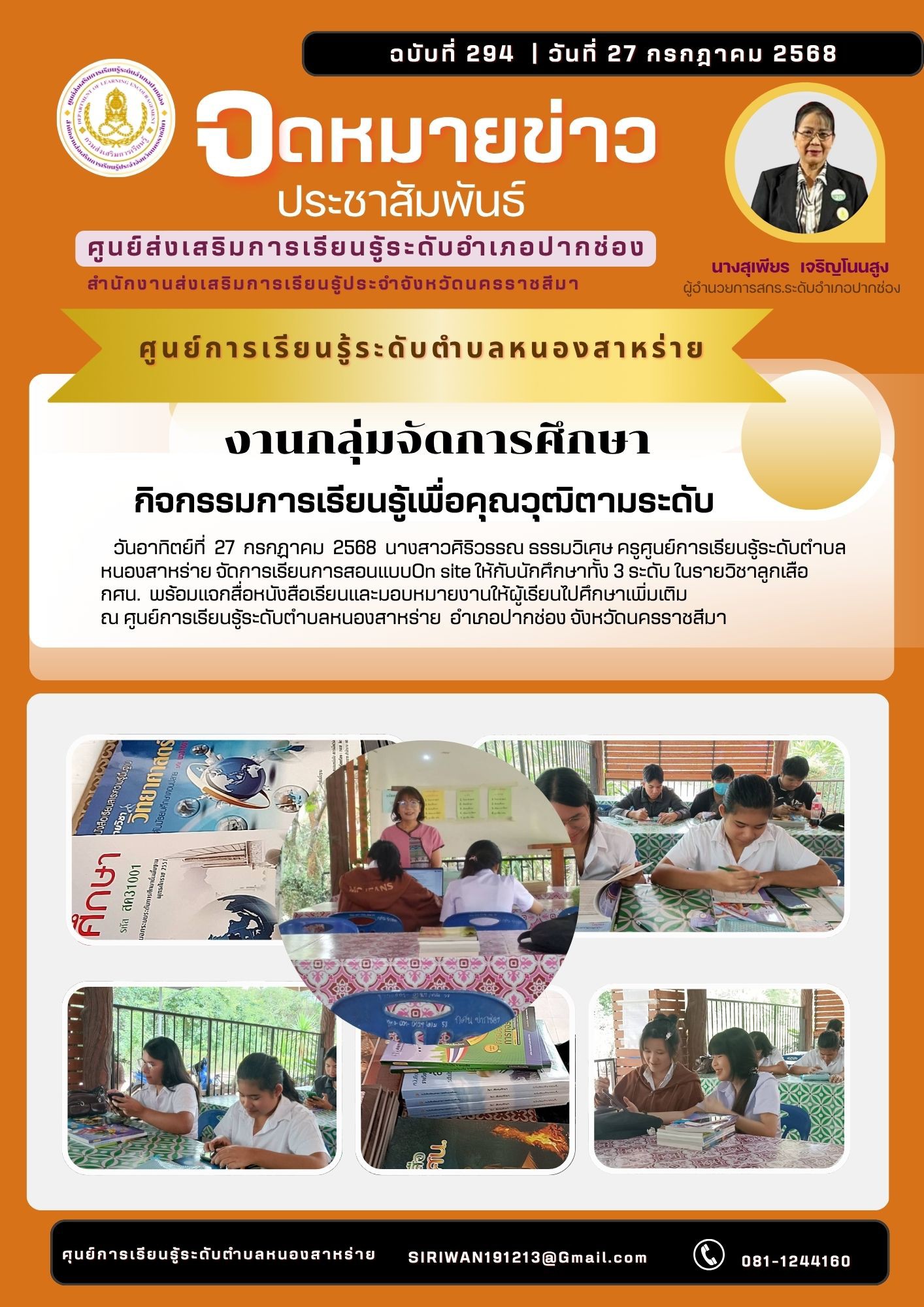 นางสาวศิริวรรณ ธรรมวิเศษ ครูศูนย์การเรียนรู้ระดับตำบลหนองสาหร่าย ได้ดำเนินการจัดกิจกรรมการเรียนการสอนให้กับนักศึกษาทั้ง 3ระดับในรายวิชาลูกเสือกศน.พร้อมแจกสื่อหนังสือเรียน ให้กับผู้เรียน ณ ศกร.ระดับตำบลหนองสาหร่าย อ.ปากช่อง จ.นครราชสีมา