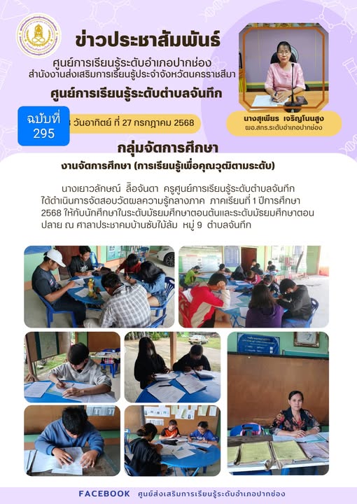 นางเยาวลักษณ์ ลืิอจันดา ครูศูนย์การเรียนรู้ระดับตำบลจันทึก ได้ดำเนินการจัดสอบวัดผลความรู้กลางภาค ภาคเรียนที่ 1 ปีการศึกษา 2568 ให้กับนักศึกษาในระดับมัธยมศึกษาตอนต้นและระดับมัธยมศึกษาตอนปลาย ณ ศาลาประชาคมบ้านซับไม้ล้ม หมู่ 9 ตำบลจันทึก