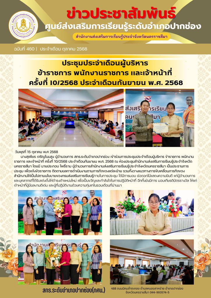 นางสุเพียร เจริญโนนสูง ผู้อำนวยการ สกร.ระดับอำเภอปากช่อง เข้าร่วมการประชุมประจำเดือนผู้บริหาร ข้าราชการ พนักงานราชการ และเจ้าหน้าที่ ครั้งที่ 10/2568 ประจำเดือนกันยายน พ.ศ. 2568 ณ ห้องประชุมสำนักงานส่งเสริมการเรียนรู้ประจำจังหวัดนครราชสีมา โดยมี นายประกอบ โพธิ์ราม ผู้อำนวยการสำนักงานส่งเสริมการเรียนรู้ประจำจังหวัดนครราชสีมา เป็นประธานการประชุม เพื่อแจ้งข้อราชการ ติดตามผลการดำเนินงานตามภารกิจของแต่ละฝ่าย รวมทั้งวางแนวทางการขับเคลื่อนภารกิจของสำนักงานให้เป็นไปตามนโยบายของกรมส่งเสริมการเรียนรู้ภายในการประชุม ได้มีการมอบ ช่อดอกไม้แสดงความยินดี แก่ผู้อำนวยการและบุคลากรที่ได้รับแต่งตั้งให้ดำรงตำแหน่งใหม่ เพื่อเป็นขวัญและกำลังใจในการปฏิบัติหน้าที่ อีกทั้งยังมีการ มอบเกียรติบัตรรางวัล ให้แก่เจ้าหน้าที่ผู้มีผลงานดีเด่น และผู้ที่ปฏิบัติงานด้วยความทุ่มเทในรอบเดือนที่ผ่านมา
