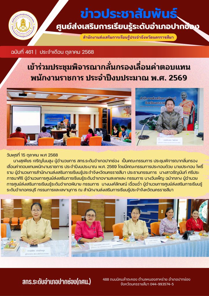 นางสุเพียร เจริญโนนสูง ผู้อำนวยการ สกร.ระดับอำเภอปากช่อง เป็นคณะกรรมการ ประชุมพิจารณากลั่นกรองเลื่อนค่าตอบแทนพนักงานราชการ ประจำปีงบประมาณ พ.ศ. 2569 โดยมีคณะกรรมการประกอบด้วย นายประกอบ โพธิ์ราม ผู้อำนวยการสำนักงานส่งเสริมการเรียนรู้ประจำจังหวัดนครราชสีมา ประธานกรรมการ นางสาวธัญนันท์ ศรีประภาธนาศิริ ผู้อำนวยการศูนย์ส่งเสริมการเรียนรู้ระดับอำเภอขามสะแกแสง กรรมการ นางวันเพ็ญ ฉนำกลาง ผู้อำนวยการศูนย์ส่งเสริมการเรียนรู้ระดับอำเภอพิมาย กรรมการ นางนงค์ลักษณ์ เฉื่อยฉ่ำ ผู้อำนวยการศูนย์ส่งเสริมการเรียนรู้ระดับอำเภอครบุรี กรรมการและเลขานุการ ณ สำนักงานส่งเสริมการเรียนรู้ประจำจังหวัดนครราชสีมา
