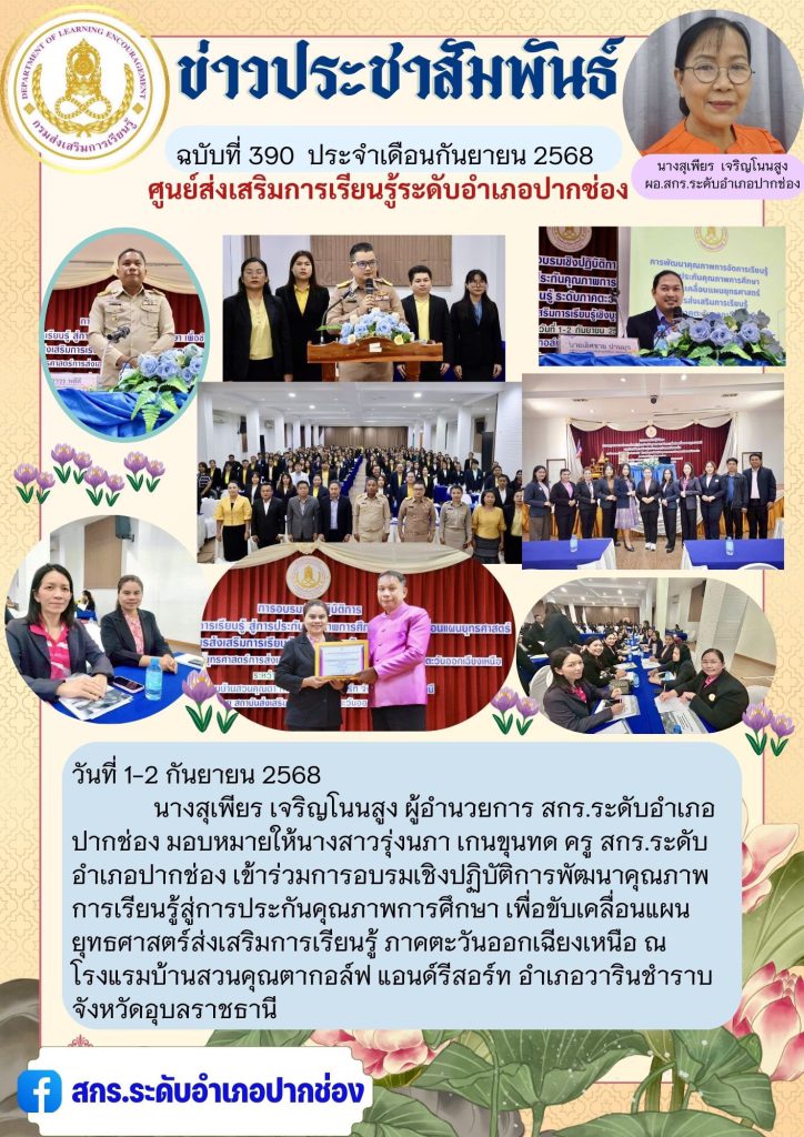 นางสุเพียร เจริญโนนสูง ผู้อำนวยการ สกร.ระดับอำเภอปากช่อง มอบหมายให้นางสาวรุ่งนภา เกนขุนทด ครู สกร.ระดับอำเภอปากช่อง เข้าร่วมการอบรมเชิงปฏิบัติการพัฒนาคุณภาพการเรียนรู้สู่การประกันคุณภาพการศึกษา เพื่อขับเคลื่อนแผนยุทธศาสตร์ส่งเสริมการเรียนรู้ ภาคตะวันออกเฉียงเหนือ ณ โรงแรมบ้านสวนคุณตากอล์ฟ แอนด์รีสอร์ท อ.วารินชำราบ จ.อุบลราชธานี