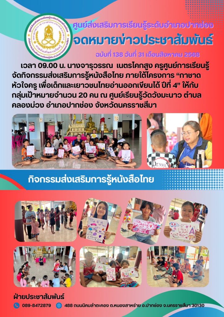 นางจารุวรรณ เนตรโคกสูง ครูศูนย์การเรียนรู้ จัดกิจกรรมส่งเสริมการรู้หนังสือไทย ภายใต้โครงการ “กาชาดหัวใจครู เพื่อเด็กและเยาวชนไทยอ่านออกเขียนได้ ปีที่ 4” ให้กับกลุ่มเป้าหมายจำนวน 20 คน ณ ศูนย์เรียนรู้วัดวังมะนาว ตําบลคลองม่วง อำเภอปากช่อง จังหวัดนครราชสีมา