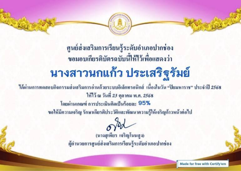 ศูนย์การเรียนรู้ระดับตำบลขนงพระ ได้รับมอบหมายจาก นางสุเพียร เจริญโนนสูง ผู้อำนวยการศูนย์ส่งเสริมการเรียนรู้ระดับอำเภอปากช่อง จัดกิจกรรมส่งเสริมการอ่านออนไลน์ “วันปิยมหาราช” ประจำปี 2568 สำหรับนักศึกษาและประชาชนทั่วไป ผ่านลิ้ง https://forms.gle/XtEK5SPC53F7PtN99 คำชี้แจง : แบบทดสอบความรูู้ด้วยระบบออนไลน์ เนื่องใน “วันปิยมหาราช” ประจำปี 2568 เมื่อตอบคำถามถูกร้อยละ 80 ขึ้นไป ถือว่าท่านผ่านเกณฑ์การทดสอบ โดยตรวจผลคะแนนได้ทันที และสามารถรอรับเกียรติบัตรได้ที่อีเมลที่ท่านลงทะเบียน หมายเหตุ : กรุณากรอกอีเมลให้ถูกต้อง และต้องเป็น Gmail เท่านั้น จึงจะได้รับเกียรติบัตร (จำกัดจำนวน 60 คน/วัน)