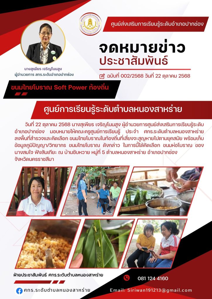 วันที่22 ตุลาคม 2568 คณะครูศกร.ระดับตำบลหนองสาหร่าย ลงพื้นที่สำรวจข้อมูลขนมไทยโบราณ ท้องถิ่นที่เสี่ยงจะสูญหาย ตามยุคสมัย ในพื้นที่ตำบลหนองสาหร่าย ตามโครงการ“Sweet Heritage : ขนมไทยโบราณ Soft Power จะคงอยู่ By สกร.” โดยคัดเลือกขนมห่อโบราณ ของนางสมใจ ฟังสันเทียะ..เป็นภูมิปัญญาด้านการทำขนมไทยโบราณ ที่เสี่ยงจะสูญหายไป ณ บ้านซับหวาย หมูที่ 5 ตำบลหนองสาหร่าย อำเภอปากช่อง จังหวัดนครราชสีมา