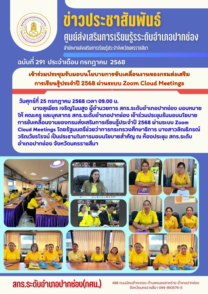 นางสุเพียร เจริญโนนสูง ผู้อำนวยการ สกร.ระดับอำเภอปากช่อง มอบหมายให้ คณะครู และบุคลากร สกร.ระดับอำเภอปากช่อง เข้าร่วมประชุมรับมอบนโยบายการขับเคลื่อนงานของกรมส่งเสริมการเรียนรู้ประจำปี 2568 ผ่านระบบ Zoom Cloud Meetings โดยรัฐมนตรีช่วยว่าการกระทรวงศึกษาธิการ นางสาวลิณธิภรณ์ วริณวัชรโรจน์ เป็นประธานในการมอบนโยบายสำคัญ ณ ห้องประชุม สกร.ระดับอำเภอปากช่อง จังหวัดนครราชสีมา