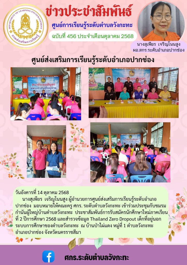 นางสุเพียร เจริญโนนสูง ผู้อำนวยการศูนย์ส่งเสริมการเรียนรู้ระดับอำเภอปากช่อง มอบหมายให้คณะครู ศกร. ระดับตำบลวังกะทะ เข้าร่วมประชุมกับชมรมกำนันผู้ใหญ่บ้านตำบลวังกะทะ ประชาสัมพันธ์การรับสมัครนักศึกษาใหม่ภาคเรียนที่ 2 ปีการศึกษา 2568 และสำรวจข้อมูล Thailand Zero Dropout เด็กที่อยู่นอกระบบการศึกษาของตำบลวังกะทะ ณ บ้านป่าไผ่แดง หมู่ที่ 1 ตำบลวังกะทะ อำเภอปากช่อง จังหวัดนครราชสีมา