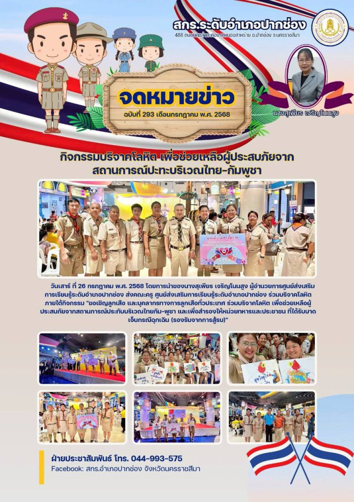นางสุเพียร เจริญโนนสูง ผู้อำนวยการศูนย์ส่งเสริมการเรียนรู้ระดับอำเภอปากช่อง มอบหมายให้ คณะครู ศูนย์ส่งเสริมการเรียนรู้ระดับอำเภอปากช่อง ร่วมบริจาคโลหิตภายใต้กิจกรรม “ขอเชิญลูกเสือ และบุคลากรทางการลูกเสือทั่วประเทศ ร่วมบริจาคโลหิต เพื่อช่วยเหลือผู้ประสบภัยจากสถานการณ์ประทับบริเวณไทยกัมพูชา และเพื่อสำรองให้หน่วยทหารและประชาชน ที่ได้รับบาดเจ็บกรณีฉุกเฉิน (รองรับจากการสู้รบ)”