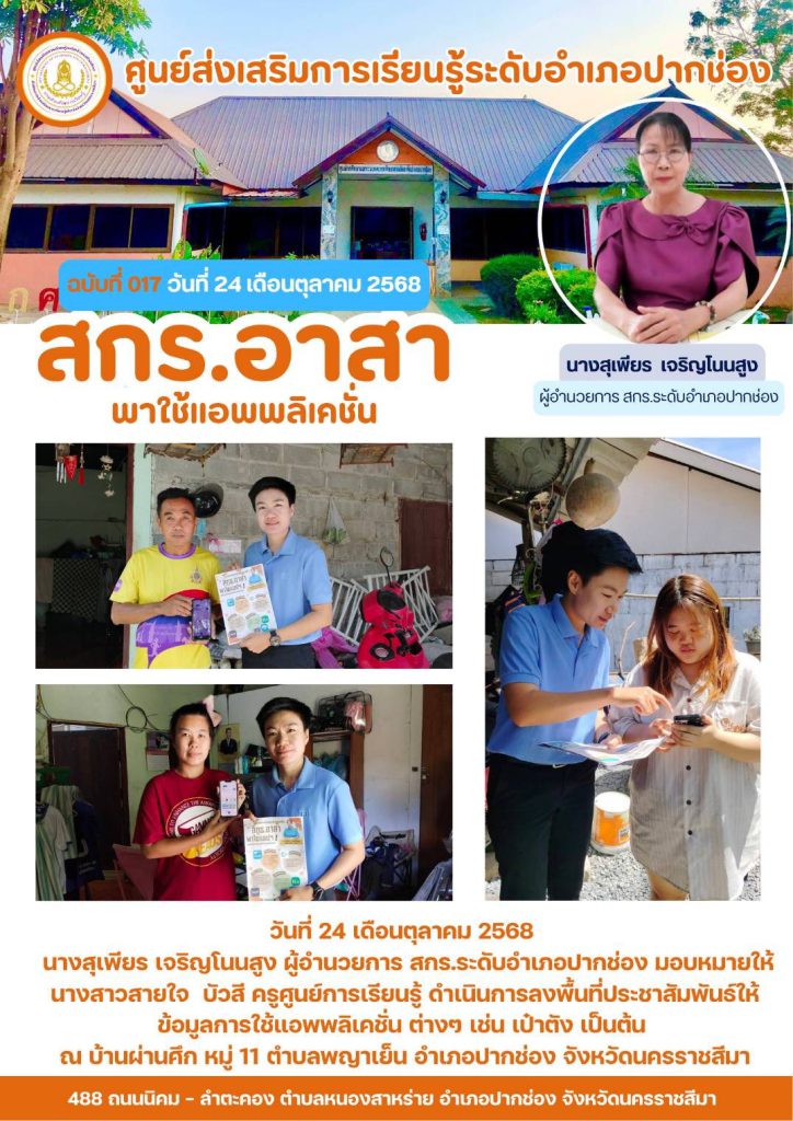 นางสาวสายใจ บัวสี ครูศูนย์การเรียนรู้ดำเนินการลงพื้นที่ประชาสัมพันธ์รับสมัครนักศึกษาใหม่ ภาคเรียนที่ 2 ปีการศึกษา 2568 และประชาสัมพันธ์ให้การใช้แอพพลิเคชั่น ต่างๆ เช่น เป๋าตัง เป็นต้น ณ บ้านผ่านศึก หมู่ 11 ตำบลพญาเย็น อำเภอปากช่อง จังหวัดนครราชสีมา