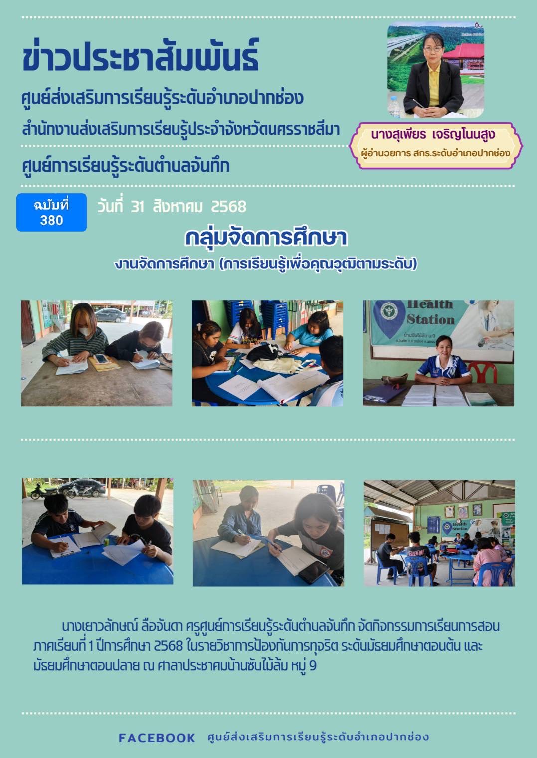 นางเยาวลักษณ์ ลือจันดา ครูศูนย์การเรียนรู้ระดับตำบลจันทึกจัดกิจกรรมการเรียนการสอน ภาตเรียนที่ 1 ปีการศึกษา 2568 รายวิชา การป้องกันการทุจริต ระดับมัธยมศึกษาตอนต่นและระดับมัธยมศึกษาตอนปลาย ณ ศาลาประชาคมบ้านซับไม้ล้ม