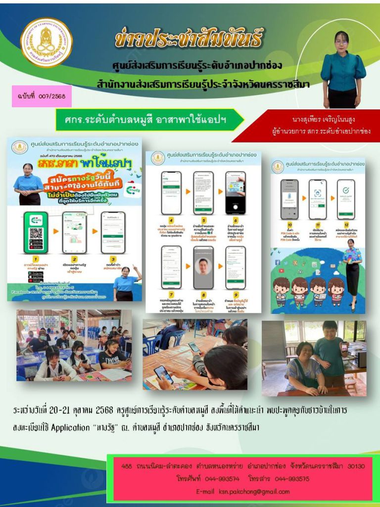 ระหว่างวันที่ 20-21 ตุลาคม 2568 ครูศูนย์การเรียนรู้ระดับตำบลหมูสี ลงพื้นที่ให้คำแนะนำ พบปะพูดคุยกับชาวบ้านในการลงทะเบียนใช้ Application “ทางรัฐ” ณ. ตำบลหมูสี อำเภอปากช่อง จังหวัดนครราชสีมา