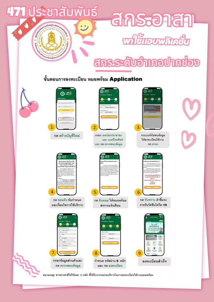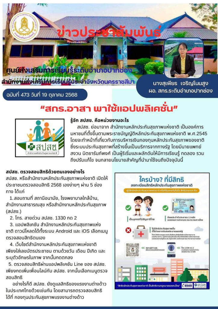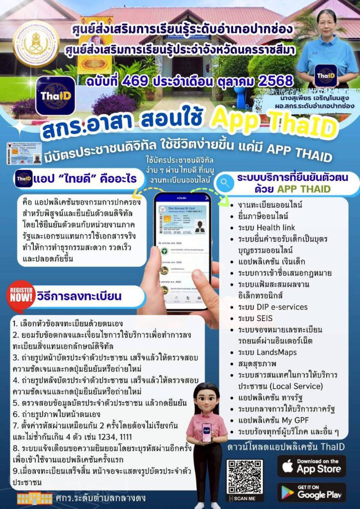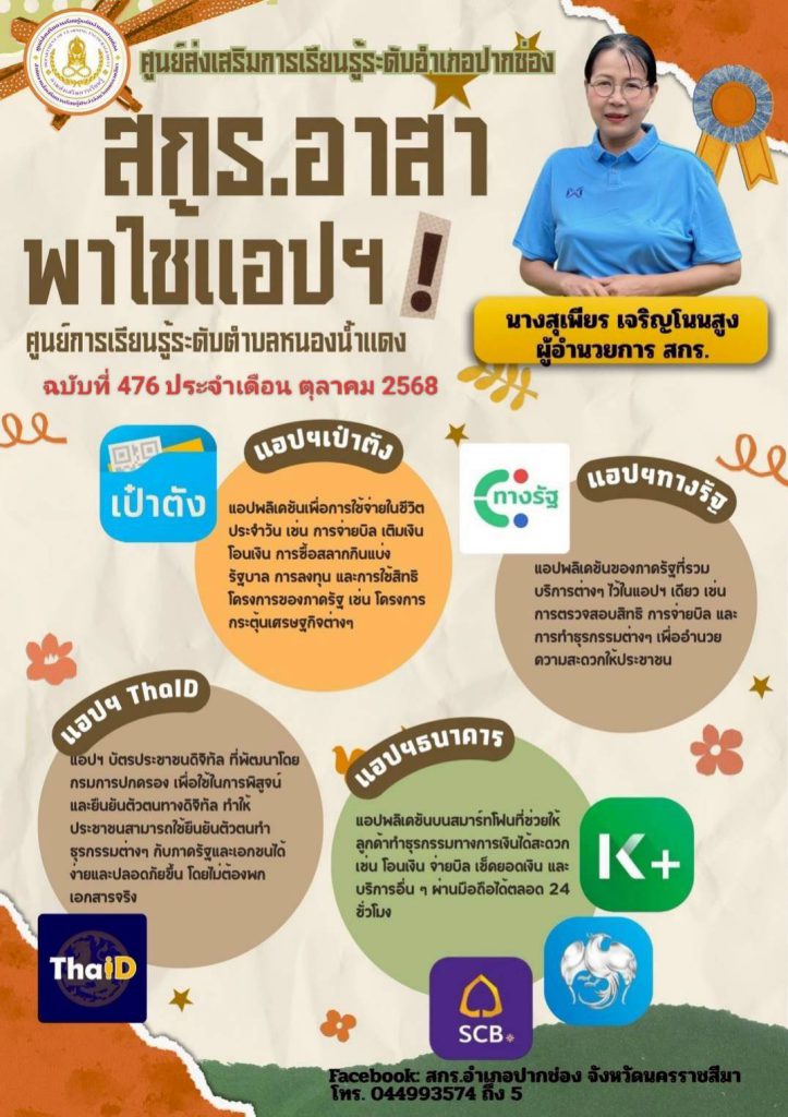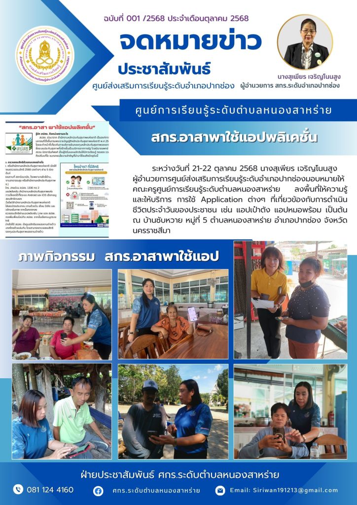 ระหว่างวันที่ 21-22 ตุลาคม 2568 นางสุเพียร เจริญโนนสูง ผู้อำนวยการศูนย์ส่งเสริมการเรียนรู้ระดับอำเภอปากช่อง มอบหมายให้คณะครูศูนย์การเรียนรู้ ศกร.ระดับตำบลหนองสาหร่าย ลงพื้นที่ให้ความรู้ และแนะนำ การใช้ Application ต่างๆ ที่เกี่ยวข้องกับการดำเนินชีวิตประจำวันของประชาชน เช่น แอปเป๋าตัง แอปหมอพร้อม แอปถุงเงิน เป็นต้น ณ บ้านซับหวาย หมู่ที่ 5 ต.หนองสาหร่าย อ.ปากช่อง จ.นครราชสีมา
