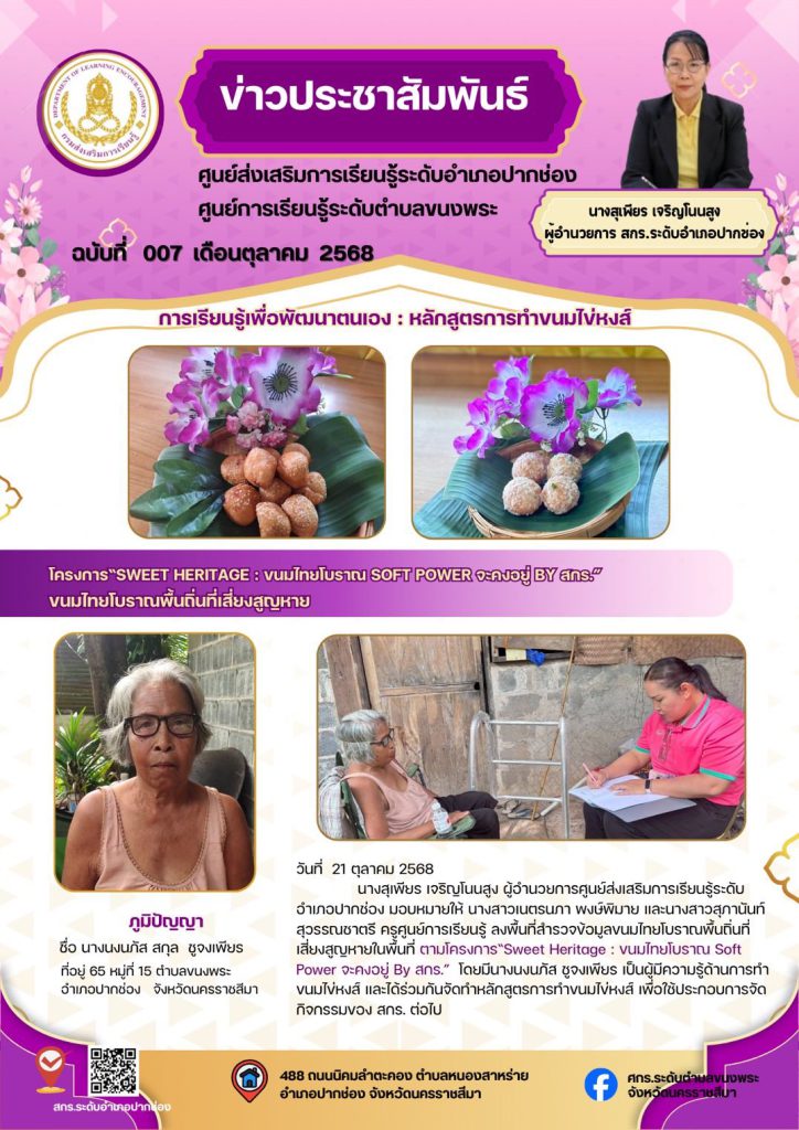นางสุเพียร เจริญโนนสูง ผู้อำนวยการศูนย์ส่งเสริมการเรียนรู้ระดับอำเภอปากช่อง มอบหมายให้ นางสาวเนตรนภา พงษ์พิมาย และนางสาวสุภานันท์ สุวรรณชาตรี ครูศูนย์การเรียนรู้ ลงพื้นที่สำรวจข้อมูลขนมไทยโบราณพื้นถิ่นที่เสี่ยงสูญหายในพื้นที่ ตามโครงการ“Sweet Heritage : ขนมไทยโบราณ Soft Power จะคงอยู่ By สกร.” โดยมีนางนงนภัส ชูจงเพียร เป็นผู้มีความรู้ด้านการทำขนมไข่หงส์ และได้ร่วมกันจัดทำหลักสูตรการทำขนมไข่หงส์ เพื่อใช้ประกอบการจัดกิจกรรมของ สกร. ต่อไป