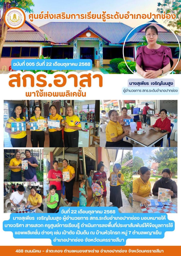 นางสุเพียร เจริญโนนสูง ผู้อำนวยการ สกร.ระดับอำเภอปากช่อง มอมอบหมายให้นางวริศา สารเสวก ครูศูนย์การเรียนรู้ ดำเนินการลงพื้นที่ประชาสัมพันธ์ให้ข้อมูลการใช้แอพพลิเคชั่น ต่างๆ เช่น เป้าตั้ง เป็นต้น ณ บ้านหัวโกรก หมู่ 7 ตำบลพญาเย็น อำเภอปากช่อง จังหวัดนครราชสีมา