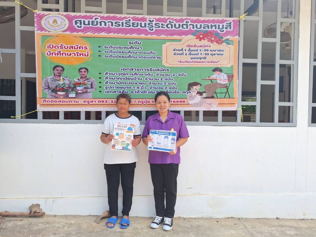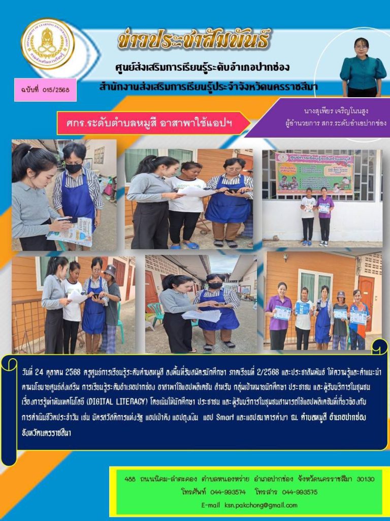 ครูศูนย์การเรียนรู้ระดับตำบลหมูสี ลงพื้นที่รับสมัครนักศึกษา ภาคเรียนที่ 2/2568 และประชาสัมพันธ์ ให้ความรู้และคำแนะนำตามนโยบายศูนย์ส่งเสริม การเรียนรู้ระดับอำเภอปากช่อง อาสาพาใช้แอปพลิเคชัน สำหรับ กลุ่มเป้าหมายนักศึกษา ประชาชน และผู้รับบริการในชุมชนเรื่องการรู้เท่าทันเทคโนโลยี (DIGITAL LITERACY) โดยเน้นให้นักศึกษา ประชาชน และผู้รับบริการในชุมชนสามารถใช้แอปพลิเคชันที่เกี่ยวข้องกับการดำเนินชีวิตประจำวัน เช่น บัตรสวัสดิการแห่งรัฐ แอปเป๋าตัง แอปถุงเงิน แอป Smart และแอปธนาคารต่างๆ ณ. ตำบลหมูสี อำเภอปากช่อง จังหวัดนครราชสีมา
