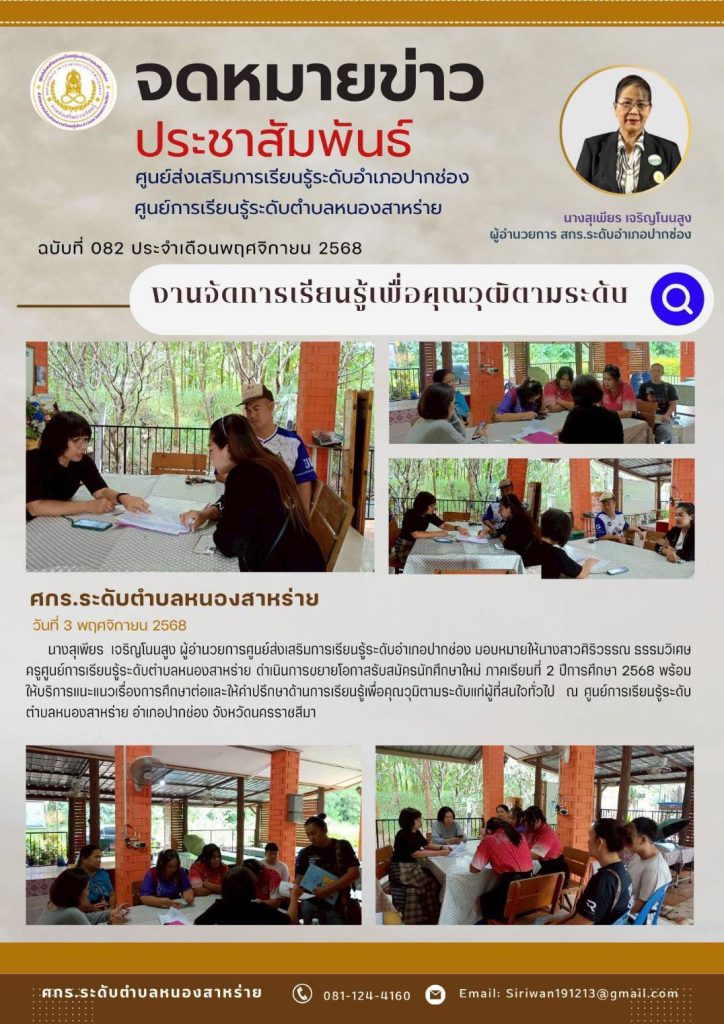 นางสุเพียร เจริญโบบสูง ผู้อำนวยการศูนย์ส่งเสริมการเรียนรู้ระดับอำเภอปากช่อง มอบหมายให้นางสาวศิริวรรณ ธรรมวิเศษ ครูศูนย์การเรียนรู้ระดับตำบลหนองสาหร่าย ดำเนินการขยายโอกาสรับสมัครนักศึกษาใหม่ ภาคเรียนที่ 2 ปีการศึกษา 25668 พร้อมให้บริการแนะแนวเรื่องการศึกษาต่อและให้ค้าปรึกษาด้านการเรียนรู้พื่อคุณวุฒิตามระดับแก่ผู้ที่สนใจทั่วไป ณ ศูนย์การเรียบรู้ระดับตำบลหมองสาหร่าย อ่าเภอปากช่อง จังหวัดนครราชสีมา