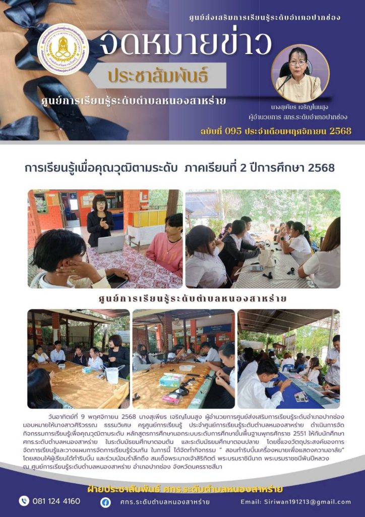 นางสาวศิริวรรณ ธรรมวิเศษ ครูศูนย์การเรียนรู้ระดับตำบลหนองสาหร่ายได้ดำเนินการจัดกิจกรรมการเรียนรู้เพื่อคุณวุฒิตามระดับ ภาคเรียนที่ 2 ปีการศึกษา 2568 ในการนี้ ได้จัดกิจกรรมการสอนทำริบบิ้น เพื่อให้ผู้เรียนได้แสดงออกถึงความรักความอาลัยและร่วมน้อมรำลึกถึงสมเด็จพระนางเจ้าสิริกิติ์ พระบรมราชินีนาถพระบรมราชชนนีพันปีหลวง ณ ศูนย์การเรียนรู้ระดับตำบลหนองสาหร่าย อำเภอปากช่อง จังหวัดนครราชสีมา