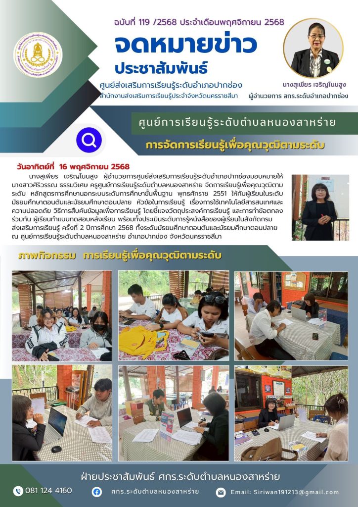 นางสาวศิริวรรณ ธรรมวิเศษ ครูศูนย์การเรียนรู้ระดับตำบลหนองสาหร่าย จัดการเรียนรู้เพื่อคุณวุฒิตามระดับหลักสูตรการศึกษานอกระบบระดับการศึกษาขั้นพื้นฐานพุทธศักราช2551ให้กับผู้เรียนในระดับมัธยมศึกษาตอนต้นและมัธยมศึกษาตอนปลายหัวข้อในการเรียนรู้เรื่องการใช้เทคโนโลยีสารสนเทศและความปลอดถัย วิธีการสืบค้นข้อมูลเพื่อการเรียนรู้ โดยชี้แจงวัตถุประสงค์การเรียนรู้ และการทำข้อตกลงร่วมกัน ผู้เรียนทำแบบทดสอบหลังเรียนพร้อมทั้งประเมินระดับการรู้หนังสือของผู้เรียนในสังกัดกรมส่งเสริมการเรียนรู้ ครั้งที่ 2 ปีการศึกษา 2568 ทั้งระดับมัธยมศึกษาตอนต้นและมัธยมศึกษาตอนปลายณ ศูนย์การเรียนรู้ระดับตำบลหนองสาหร่าย อำเภอปากช่อง จังหวัดนครราชสีมา