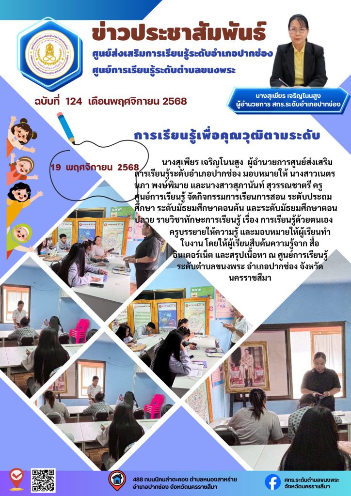 นางสุเพียร เจริญโนนสูง ผู้อำนวยการศูนย์ส่งเสริมการเรียนรู้ระดับอำเภอปากช่อง มอบหมายให้ นางสาวเนตรนภา พงษ์พิมาย และนางสาวสุภานันท์ สุวรรณชาตรี ครูศูนย์การเรียนรู้ จัดกิจกรรมการเรียนการสอน ระดับประถมศึกษา ระดับมัธยมศึกษาตอนต้น และระดับมัธยมศึกษาตอนปลาย รายวิชาทักษะการเรียนรู้ เรื่อง การเรียนรู้ด้วยตนเอง ครูบรรยายให้ความรู้ และมอบหมายให้ผู้เรียนทำใบงาน โดยให้ผู้เรียนสืบค้นความรู้จาก สื่ออินเตอร์เน็ต และสรุปเนื้อหา ณ ศูนย์การเรียนรู้ระดับตำบลขนงพระ อำเภอปากช่อง จังหวัดนครราชสีมา
