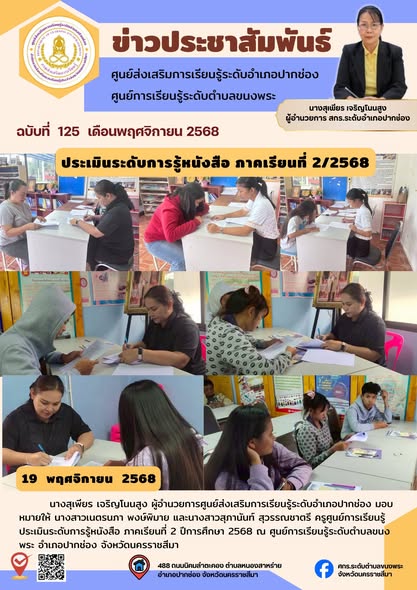 นางสุเพียร เจริญโนนสูง ผู้อำนวยการศูนย์ส่งเสริมการเรียนรู้ระดับอำเภอปากช่อง มอบหมายให้ นางสาวเนตรนภา พงษ์พิมาย และนางสาวสุภานันท์ สุวรรณชาตรี ครูศูนย์การเรียนรู้ ประเมินระดับการรู้หนังสือ ภาคเรียนที่ 2 ปีการศึกษา 2568 ณ ศูนย์การเรียนรู้ระดับตำบลขนงพระ อำเภอปากช่อง จังหวัดนครราชสีมา