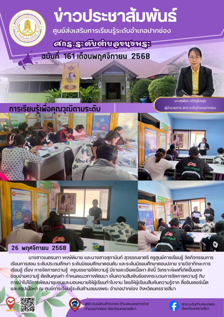 นางสาวเนตรนภา พงษ์พิมาย และนางสาวสุภานันท์ สุวรรณชาตรี ครูศูนย์การเรียนรู้ จัดกิจกรรมการเรียนการสอน ระดับประถมศึกษา ระดับมัธยมศึกษาตอนต้น และระดับมัธยมศึกษาตอนปลาย รายวิชาทักษะการเรียนรู้ เรื่อง การจัดการความรู้ ครูบรรยายให้ความรู้ มีรายละเอียดเนื้อหา ดังนี้ วิเคราะห์ผลที่เกิดขึ้นของขอบข่ายความรู้ ตัดสินคุณค่า กำหนดแนวทางพัฒนา เห็นความสัมพันธ์ของกระบวนการจัดการความรู้กับการนำไปใช้การพัฒนาชุมชนและมอบหมายให้ผู้เรียนทำใบงาน โดยให้ผู้เรียนสืบค้นความรู้จาก สื่ออินเตอร์เน็ต และสรุปเนื้อหา ณ ศูนย์การเรียนรู้ระดับตำบลขนงพระ อำเภอปากช่อง จังหวัดนครราชสีมา