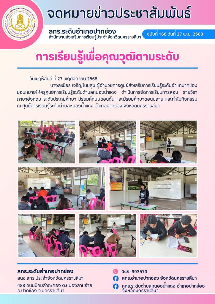นางสุเพียร เจริญโนนสูง ผู้อำนวยการศูนย์ส่งเสริมการเรียนรู้ระดับอำเเภปากช่อง มอบหมายให้ครูศูนย์การเรียนรู้ระดับตำบลหนองน้ำแดง ดำเนินการจัดการเรียนการสอน รายวิชา ภาษาอังกฤษ ระดับประถมศึกษา มัธยมศึกษษตอนต้น และมัธยมศึกษาตอนปลาย และทำใบกิจกรรม ณ ศูนย์การเรียนรู้ระดับตำบลหนองน้ำแดง อำเภอปากช่อง จังหวัดนครราชสีมา