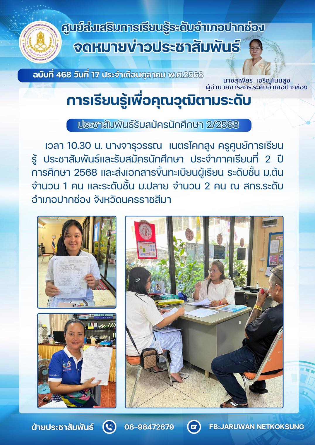 นางจารุวรรณ เนตรโคกสูง ครูศูนย์การเรียนรู้ ประชาสัมพันธ์และรับสมัครนักศึกษา ประจำภาคเรียนที่ 2 ปีการศึกษา 2568 และส่งเอกสารขึ้นทะเบียนผู้เรียน ระดับชั้น ม.ต้น จำนวน 1 คน และระดับชั้น ม.ปลาย จำนวน 2 คน ณ สกร.ระดับอำเภอปากช่อง จังหวัดนครราชสีมา