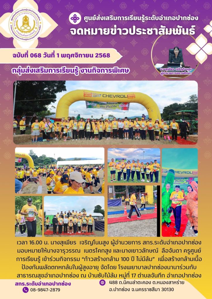 นางสุเพียร เจริญโนนสูง ผู้อำนวยการ สกร.ระดับอำเภอปากช่อง มอบหมายให้นางจารุวรรณ เนตรโคกสูง และนางเยาวลักษณ์ ลือจันดา ครูศูนย์การเรียนรู้ เข้าร่วมกิจกรรม “ก้าวสร้างกล้าม 100 ปี ไม่มีล้ม” เพื่อสร้างกล้ามเนื้อป้องกันพลัดตกหกล้มในผู้สูงอายุ จัดโดย โรงพยาบาลปากช่องนานาร่วมกับสาธารณสุขอำเภอปากช่อง ณ บ้านซับไม้ล้ม หมู่ที่ 17 ตำบลจันทึก อำเภอปากช่อง จังหวัดนครราชสีมา