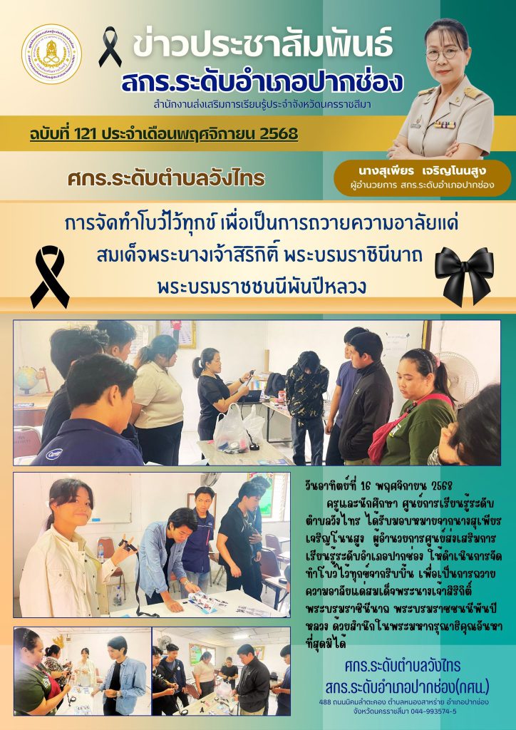 ครูและนักศึกษา ศูนย์การเรียนรู้ระดับตำบลวังไทร ได้รับมอบหมายจากนางสุเพียร เจริญโนนสูง ผู้อำนวยการศูนย์ส่งเสริมการเรียนรู้ระดับอำเภอปากช่อง ให้ดำเนินการจัดทำโบว์ไว้ทุกข์จากริบบิ้นเพื่อเป็นการถวายความอาลัยแด่สมเด็จพระนางเจ้าสิริกิติ์ พระบรมราชินีนาถ พระบรมราชชนนีพันปีหลวง ด้วยสำนึกในพระมหากรุณาธิคุณอันหาที่สุดมิได้