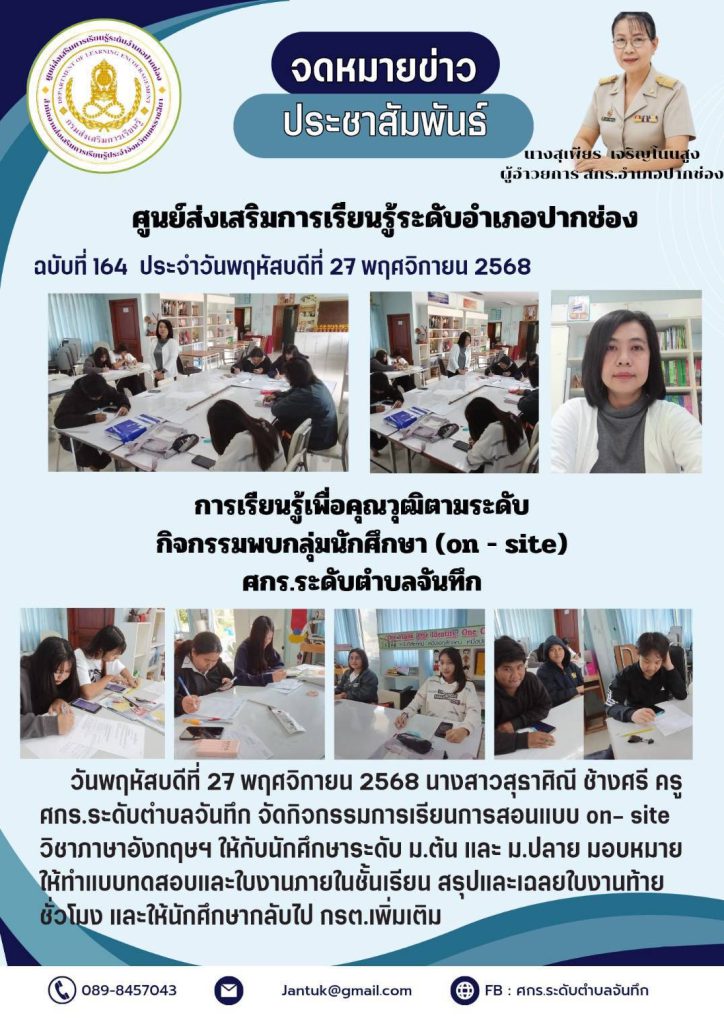 นางสาวสุธาศิณี ช้างศรี ครู ศกร. ระดับตำบลจันทึก จัดกิจกรรมการเรียนรู้เพื่อคุณวุฒิตามระดับ จัดการเรียนการสอนแบบ (on-site) รายวิชาภาษาอังกฤษฯ ให้กับผู้เรียนระดับม. ต้น และ ม. ปลาย มอบหมายให้นักศึกษาทำแบบทดสอบและใบงานท้ายชั่วโมงส่งงานและสรุปเนื้อหาพร้อมเฉลยใบงาน ให้นักศึกษากลับไป กรต.เพิ่มเติม