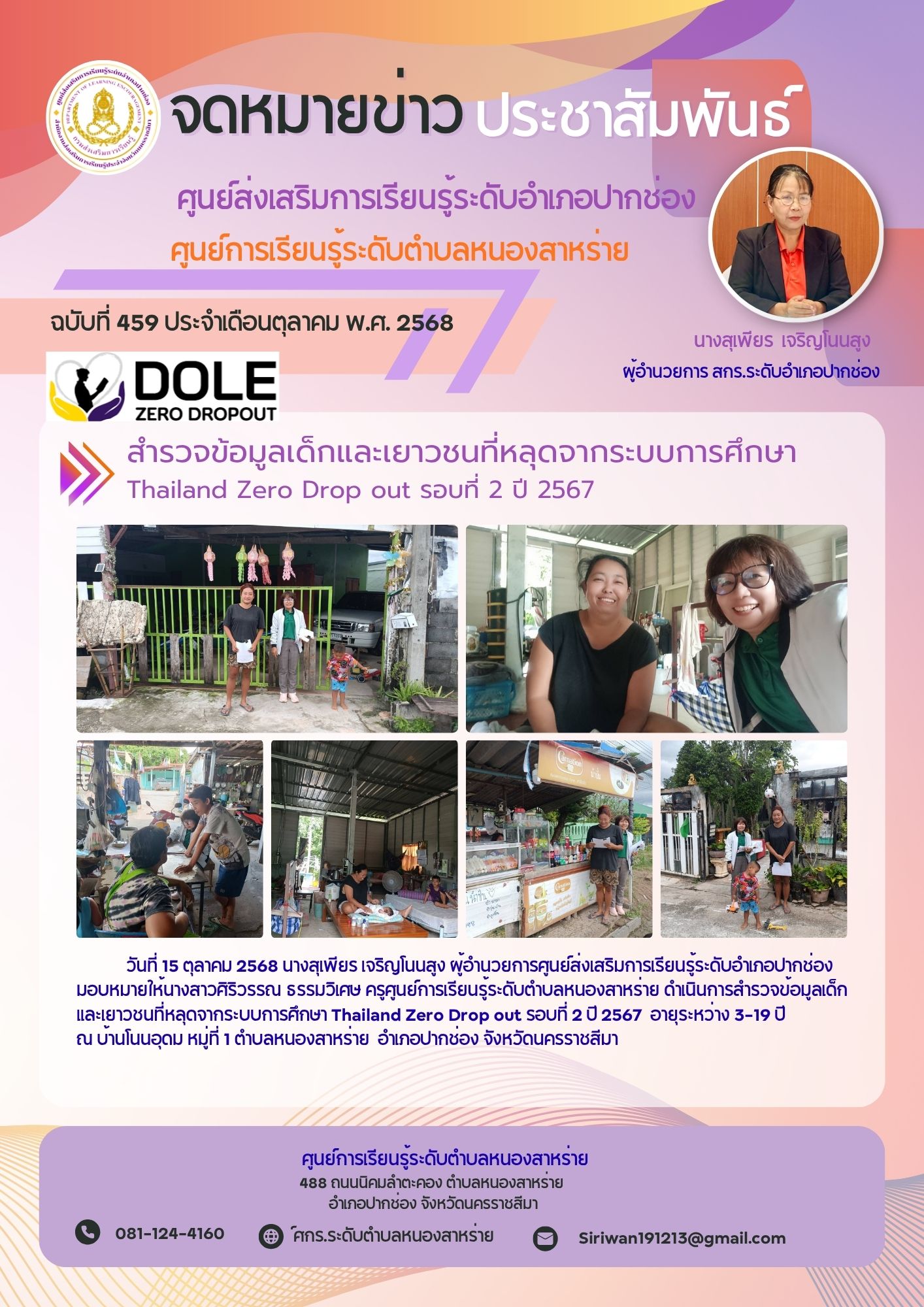 นางสาวศิริวรรณ ธรรมวิเศษ ครู ศกร.ระดับตำบลหนองสาหร่ายลงพื้นที่สำรวจข้อมูลเด็กและเยาวชนที่หลุดจากระบบ การศึกษา Thailand Zero Drop Out (รอบที่ 2 ข้อมูล 67 ช่วงอายุ 3 ถึง 19 ปี) ณ หมู่ที่ 1 บ้านโนนอุดม ตำบลหนองสาหร่าย อำเภอปากช่อง จังหวัดนครราชสีมา