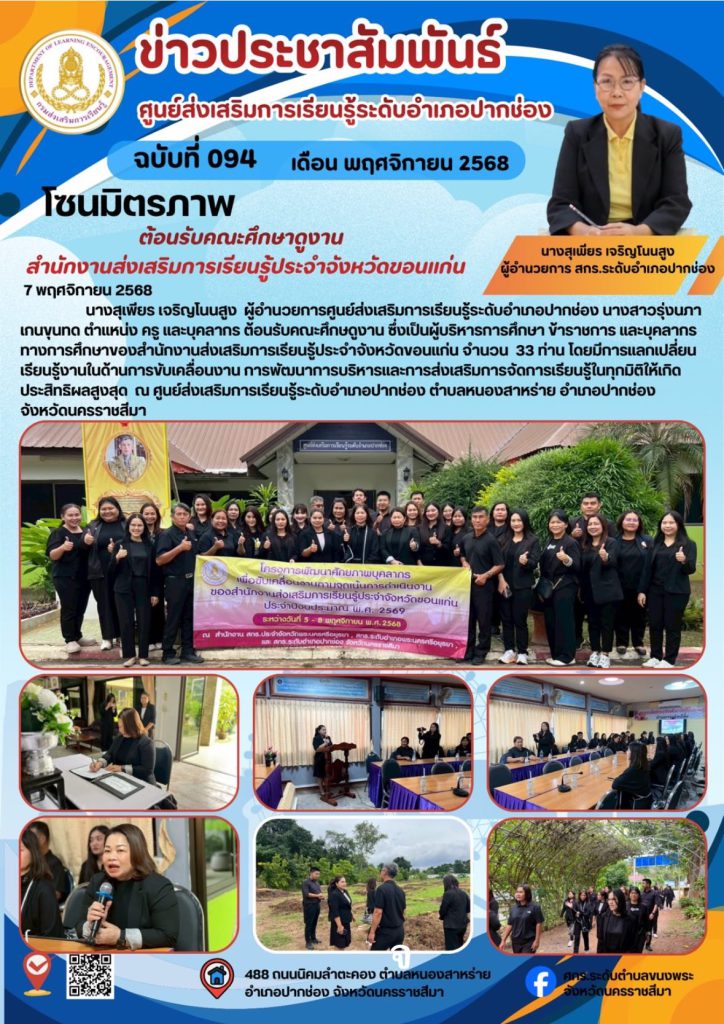 นางสุเพียร เจริญโนนสูง ผู้อำนวยการศูนย์ส่งเสริมการเรียนรู้ระดับอำเภอปากช่อง นางสาวรุ่งนภา เกนขุนทด ตำแหน่ง ครู และบุคลากร ต้อนรับคณะศึกษดูงาน ซึ่งเป็นผู้บริหารการศึกษา ข้าราชการ และบุคลากรทางการศึกษาของสำนักงานส่งเสริมการเรียนรู้ประจำจังหวัดขอนแก่น จำนวน 33 ท่าน โดยมีการแลกเปลี่ยนเรียนรู้งานในด้านการขับเคลื่อนงาน การพัฒนาการบริหารและการส่งเสริมการจัดการเรียนรู้ในทุกมิติให้เกิดประสิทธิผลสูงสุด ณ ศูนย์ส่งเสริมการเรียนรู้ระดับอำเภอปากช่อง ตำบลหนองสาหร่าย อำเภอปากช่อง จังหวัดนครราชสีมา