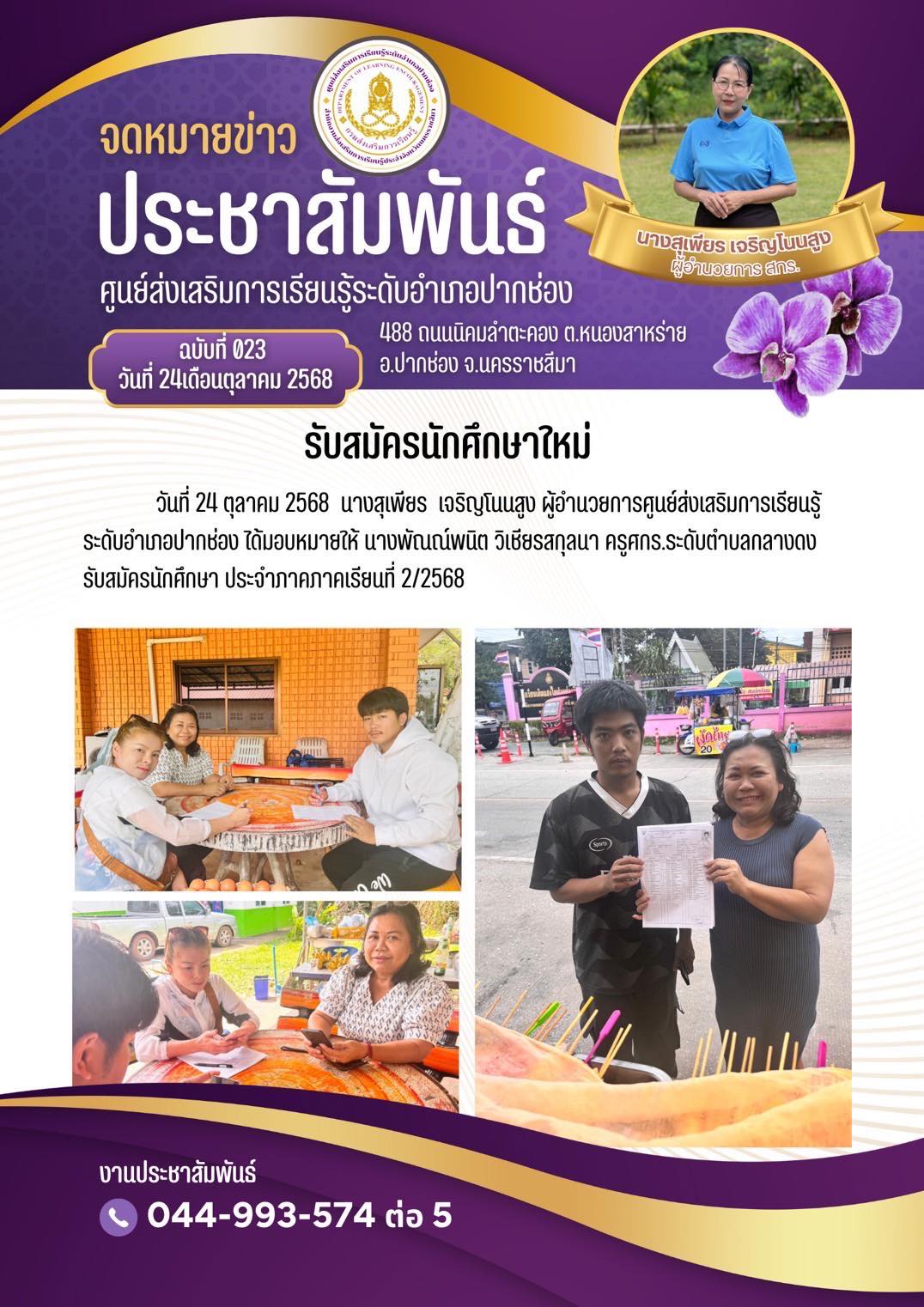 นางสุเพียร เจริญโนนสูง ผู้อำนวยการศูนย์ส่งเสริมการเรียนรู้ระดับอำเภอปากช่อง ได้มอบหมายให้ นางพัณพัณพนิต วิเชียรสกุลนา ครูศกร.ระดับตำบตำบลกลางดง รับสมัครนักศึกษา ประจำภาคภาคเรียนที่ 2/2568