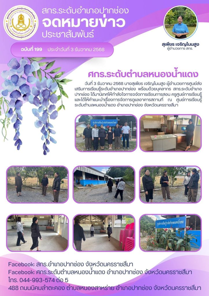 นางสุเพียร เจริญโนนสูง ผู้อำนวยการศูนย์ส่งเสริมการเรียนรู้ระดับอำเภอปากช่อง พร้อมด้วยบุคลากร สกร.ระดับอำเภอปากช่อง ได้มานิเทศให้กำลังใจการจัดการเรียนการสอน ครูศูนย์การเรียนรู้และได้ให้คำแนะนำเรื่องการจัดการดูแลอาคารสถานที่ และการปรับปรุงอาคารสถานที่ ณ ศูนย์การเรียนรู้ระดับตำบลหนองน้ำแดง อำเภอปากช่อง จังหวัดนครราชสีมา