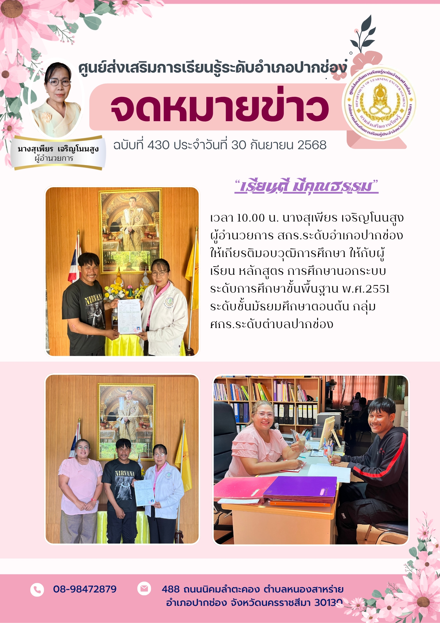เวลา 10.00 น. นางสุเพียร เจริญโนนสูง ผู้อำนวยการ สกร.ระดับอำเภอปากช่อง ให้เกียรติมอบวุฒิการศึกษา ให้กับผู้เรียน หลักสูตร การศึกษานอกระบบระดับการศึกษาขั้นพื้นฐาน พ.ศ.2551ระดับขั้นมัธยมศึกษาตอนต้น กลุ่มศกร.ระดับตำบลปากช่อง ศูนย์ส่งเสรินการเรียนรู้ระดับอำเภอปากช่อง กรมส่งเสริมการเรียนรู้