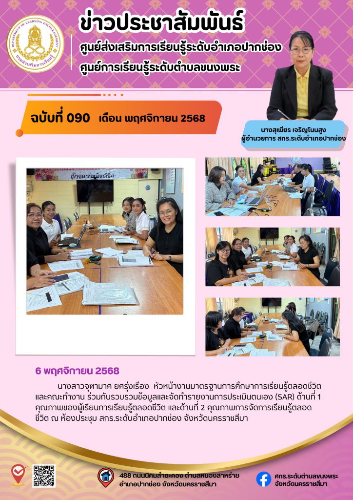 นางสาวจุฑามาศ ยศรุ่งเรือง หัวหน้างานมาตรฐานการศึกษาการเรียนรู้ตลอดชีวิต และคณะทำงาน ร่วมกันรวบรวมข้อมูลและจัดทำรายงานการประเมินตนเอง (SAR) ด้านที่ 1 คุณภาพของผู้เรียนการเรียนรู้ตลอดชีวิต และด้านที่ 2 คุณภาพการจัดการเรียนรู้ตลอดชีวิต ณ ห้องประชุม สกร.ระดับอำเภอปากช่อง จังหวัดนครราชสีมา
