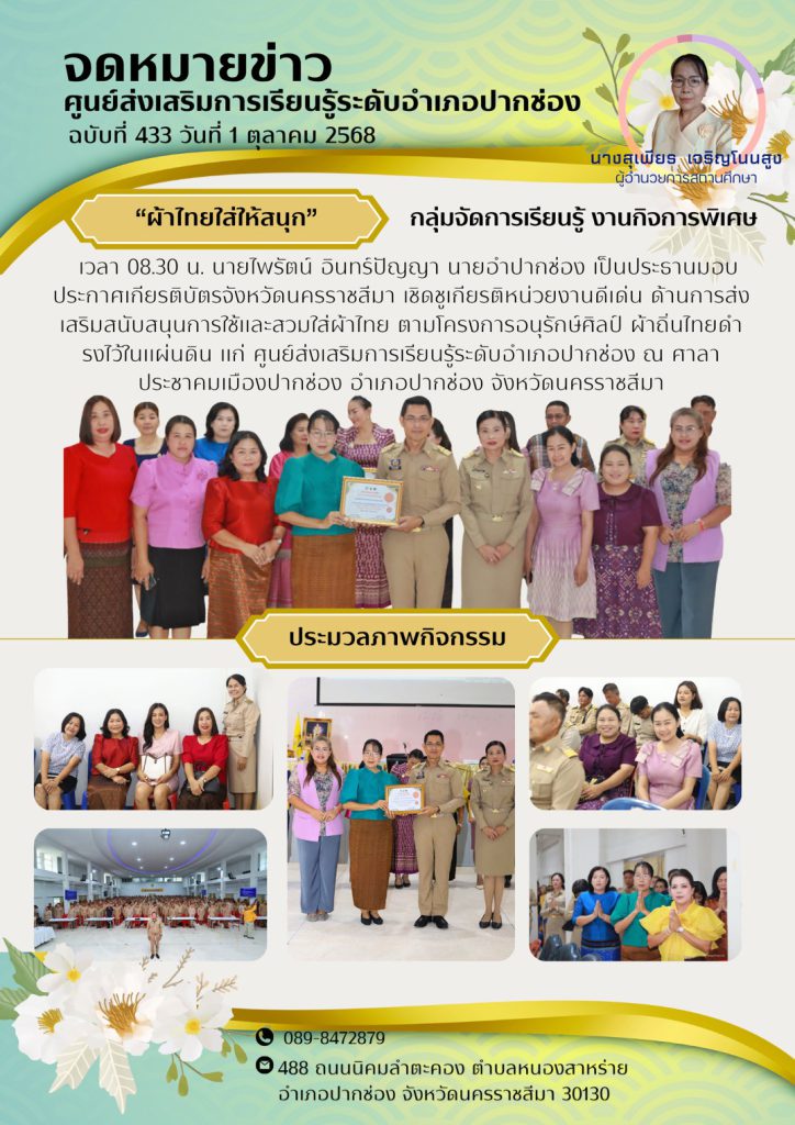 นางสุเพียร เจริญโนนสูง ผู้อำนวยการ สกร.ระดับอำเภอปากช่อง และคณะครู เข้ารับประกาศเกียรติบัตร เชิดชูเกียรติหน่วยงานดีเด่น ด้านการส่งเสริมสนับสนุนการใช้และสวมใส่ผ้าไทย ตามโครงการอนุรักษ์ศิลปิ ผ้าถิ่นไทยดำรงไว้ในแผ่นดิน โดยมีนายไพรัตน์ อินทร์ปัญญา นายอำปากช่อง เป็นประธานมอบประกาศเกียรติบัตร จังหวัดนครราชสีมา ณ ศาลาประชาคมเมืองปากช่อง อำเภอปากช่อง จังหวัดนครราชสีมา