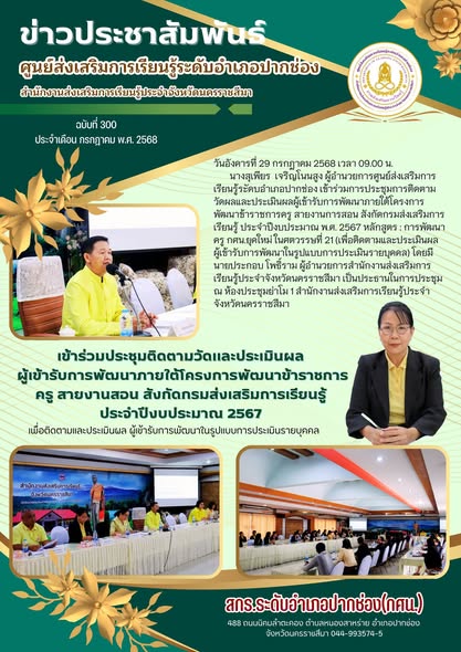 นางสุเพียร เจริญโนนสูง ผู้อำนวยการศูนย์ส่งเสริมการเรียนรู้ระัดบอำเภอปากช่อง เข้าร่วมการประชุมการติดตามวัดผลและประเมินผลผู้เข้ารับการพัฒนาภายใต้โครงการพัฒนาข้าราชการครู สายงานการสอน สังกัดกรมส่งเสริมการเรียนรู้ ประจำปีงบประมาณ พ.ศ. 2567 หลักสูตร : การพัฒนาครู กศน.ยุคใหม่ ในศตวรรษที่ 21 (เพื่อติดตามและประเมินผล ผู้เข้ารับการพัฒนาในรูปแบบการประเมินรายบุคคล) โดยมี นายประกอบ โพธิ์ราม ผู้อำนวยการสำนักงานส่งเสริมการเรียนรู้ประจำจังหวัดนครราชสีมา เป็นประธานในการประชุม ณ ห้องประชุมย่าโม 1 สำนักงานส่งเสริมการเรียนรู้ประจำจังหวัดนครราชสีมา
