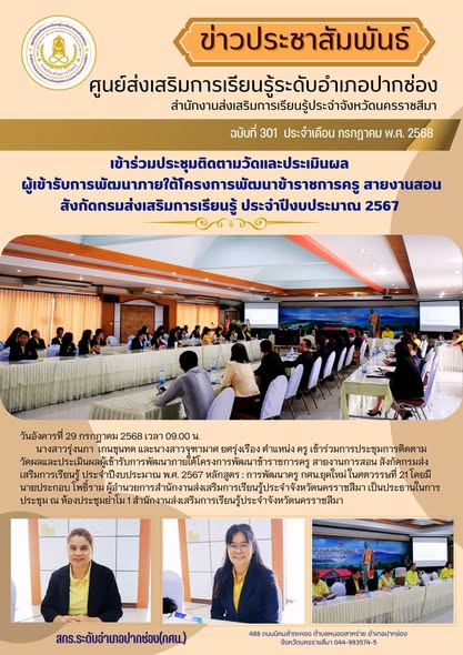 นางสาวรุ่งนภา เกนขุนทด และนางสาวจุฑามาศ ยศรุ่งเรือง ตำแหน่ง ครู เข้าร่วมการประชุมการติดตามวัดผลและประเมินผลผู้เข้ารับการพัฒนาภายใต้โครงการพัฒนาข้าราชการครู สายงานการสอน สังกัดกรมส่งเสริมการเรียนรู้ ประจำปีงบประมาณ พ.ศ. 2567 หลักสูตร : การพัฒนาครู กศน.ยุคใหม่ ในศตวรรษที่ 21 โดยมี นายประกอบ โพธิ์ราม ผู้อำนวยการสำนักงานส่งเสริมการเรียนรู้ประจำจังหวัดนครราชสีมา เป็นประธานในการประชุม ณ ห้องประชุมย่าโม 1 สำนักงานส่งเสริมการเรียนรู้ประจำจังหวัดนครราชสีมา