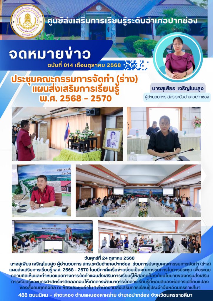 นางสุเพียร เจริญโนนสูง ผู้อำนวยการ สกร.ระดับอำเภอปากช่อง ร่วมการประชุมคณะกรรมการจัดทำ (ร่าง) แผนส่งเสริมการเรียนรู้ พ.ศ. 2568 – 2570 โดยมีภาคีเครือข่ายร่วมเป็นคณะกรรมการในการประชุม เพื่อระดมความคิดเห็นและกำหนดแนวทางการจัดทำแผนส่งเสริมการเรียนรู้ให้สอดคล้องกับนโยบายของกรมส่งเสริมการเรียนรู้และยุทธศาสตร์ชาติตลอดจนให้เกิดการพัฒนาการจัดการเรียนรู้ที่ตอบสนองต่อการเปลี่ยนแปลงของสังคมยุคดิจิทัล ณ ห้องประชุมย่าโม 1 สำนักงานส่งเสริมการเรียนรู้ประจำจังหวัดนครราชสีมา