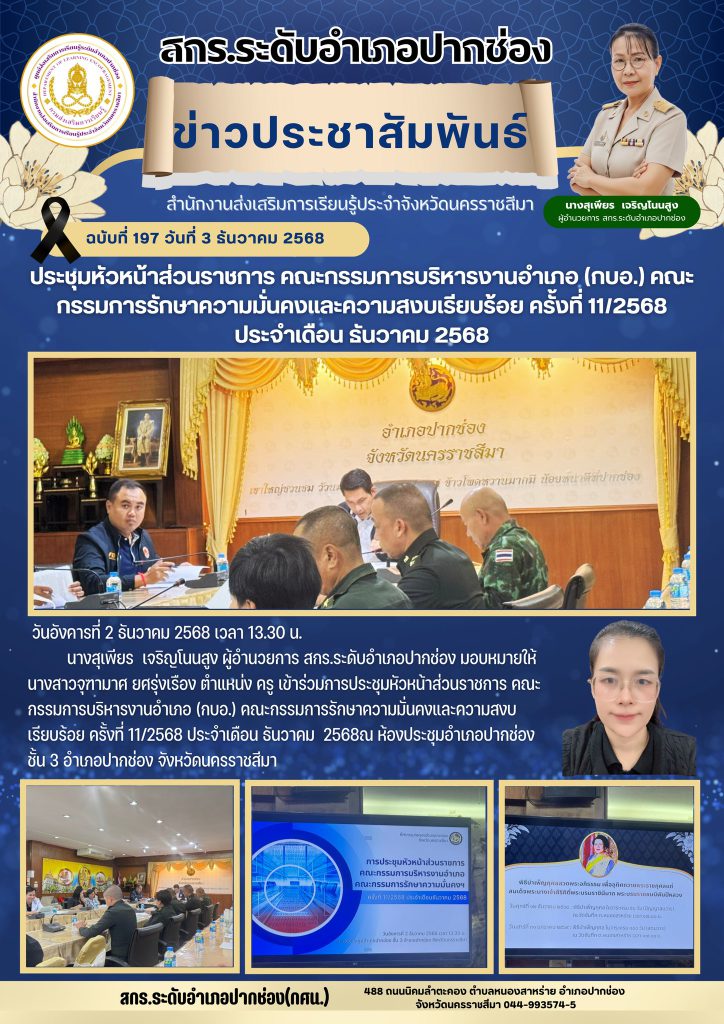 นางสุเพียร เจริญโนนสูง ผู้อำนวยการ สกร.ระดับอำเภอปากช่อง มอบหมายให้ นางสาวจุฑามาศ ยศรุ่งเรือง ตำแหน่ง ครู เข้าร่วมการประชุมหัวหน้าส่วนราชการ คณะกรรมการบริหารงานอำเภอ (กบอ.) คณะกรรมการรักษาความมั่นคงและความสงบเรียบร้อย ครั้งที่ 11/2568 ประจำเดือน ธันวาคม 2568ณ ห้องประชุมอำเภอปากช่อง ชั้น 3 อำเภอปากช่อง จังหวัดนครราชสีมา