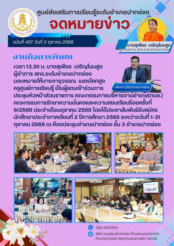 นางสุเพียร เจริญโนนสูง ผู้อำการ สกร.ระดับอำเภอปากช่อง มอบหมายให้นางจารุวรรณ เนตรโคกสูง ครูศูนย์การเรียนรู้ เป็นผู้แทนเข้าร่วมการประชุมหัวหน้าส่วนราชการ คณะกรรมการบริหารงานอำเภอ(กบอ.) คณะกรรมการรักษาความมั่นคงและความสงบเรียบร้อยครั้งที่ 9/2568 ประจำเดือนตุลาคม 2568 โดยได้ประชาสัมพันธ์รับสมัครนักศึกษาประจำภาคเรียนที่ 2 ปีการศึกษา 2568 ระหว่างวันที่ 1-31 ตุลาคม 2568 ณ ห้องประชุมอำเภอปากช่อง ชั้น 3 อำเภอปากช่อง จังหวัดนครราชสีมา