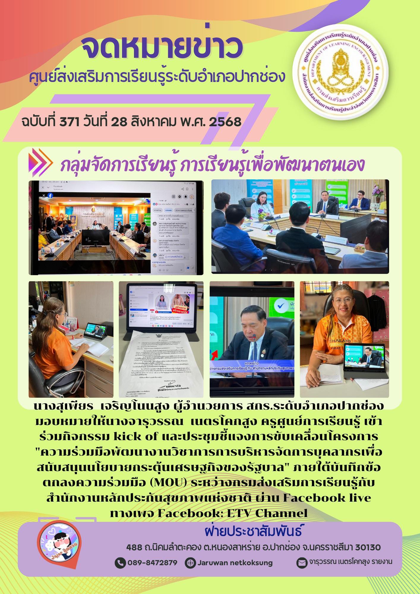 นางสุเพียร เจริญโนนสูง ผู้อำนวยการ สกร.ระดับอำเภอปากช่อง มอบหมายให้นางจารุวรรณ เนตรโคกสูง ครูศูนย์การเรียนรู้ เข้าร่วมกิจกรรม kick of และประชุมชี้แจงการขับเคลื่อนโครงการ “ความร่วมมือพัฒนางานวิชาการการบริหารจัดการบุคลากรเพื่อสนับสนุนนโยบายกระตุ้นเศรษฐกิจของรัฐบาล” ภายใต้บันทึกข้อตกลงความร่วมมือ (MOU) ระหว่างกรมส่งเสริมการเรียนรู้กับสำนักงานหลักประกันสุขภาพแห่งชาติโดยมีเจตนารมณ์ของความร่วมมือ ดังนี้ ๑. สนับสนุนนโยบายกระตุ้นเศรษฐกิจของรัฐบาล ตามแนวปฏิบัติการจ่ายค่าบริการสาธารณสุขสำหรับผู้ที่มีภาวะพึ่งฟิงเพื่อเป็นค่าจ้างผู้ช่วยเหลือดูแลผู้ที่มีภาวะพึ่งพิงในชมชน์ตามนโยบายกระต้นเศรษฐกิจของรัฐบาล ประจำปิ๊งบประมาณ พ.ศ.๒๕๖๘ ๒. สนับสนุนให้มีการพัฒนาหลักสูตรการศึกษา งานวิชาการที่เอื้อต่อการพัฒนาทักษะบุคคลในด้านการช่วยเหลือดูแลผู้สูงอายุหรือผู้ที่มีภาวะพึ่งพึ่งพิงในชุมชน ๓. สนับสนุนการวิจัย การฝึกอบรม การบริการวิชาการ และการประชาสัมพันธ์ให้ชุมชนตระหนักในเรื่องสังคมสูงวัย และเรื่องที่เกี่ยวข้องกับการดูแลผู้สูงอายุผ่าน Facebook live ทางเพจ Facebook: ETV Channe