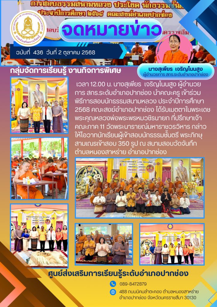 นางสุเพียร เจริญโนนสูง ผู้อำนวยการ สกร.ระดับอำเภอปากช่อง และคณะครู เข้าร่วมพิธีการสอบนักธรรมสนามหลวง ประจำปีการศึกษา ๒๕๖๘ คณะสงฆ์อำเภอปากช่อง ในครั้งนี้ ได้รับเมตตาในพระเดชพระคุณหลวงพ่อพระพรหมวชิรนายก ที่ปรึกษาเจ้าคณะภาค ๑๑ วัดพระนารายณ์มหาราชวรวิหารกล่าวให้โอวาทนักเรียนผู้เข้าสอบนักธรรมชั้นตรี พระภิกษุสามเณรเข้าสอบจำนวน ๓๕๐ รูป ณ สนามสอบวัดจันทึก ตำบลหนองสาหร่าย อำเภอปากช่อง จังหวัดนครราชสีมา