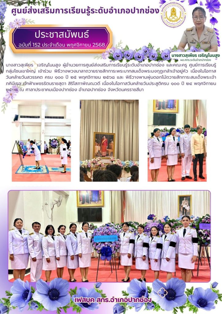 นางสาวสุเพียร เจริญโนนสูง ผู้อ่านวยการศูนย์ส่งเสริมการเรียนรู้ระดับอำเภอปากช่อง และคณะครู ศูนย์การเรียนรู้ กลุ่มโซนเขาใหญ่ เข้าร่วม พิธีวางพวงมาลาถวายราชสักการะพระบาทสมเด็จพระมงกุฎเกล้าเจ้าอยู่หัว เนื่องในโอกาสวันคล้ายวันสวรรคต ครบ ๑๐๐ ปี ๒๕ พฤศวิกายน ๒๕๖๘ และ พิธีวางพานพุ่มดอกไม้ถวายสักการะสมเด็อพระเจ้าภคินีเธอ เจ้าฟ้าเพชรรัตนราชสุดา สิริโสภาพัณณวดี เนื่องในโอกาสวันคล้ายวันประสูติครบ ๑๐๐ ปี ๒๕ พฤศวิกายน ๒๕๖๘ ณ ศาลาประชาคมเมืองปากช่อง