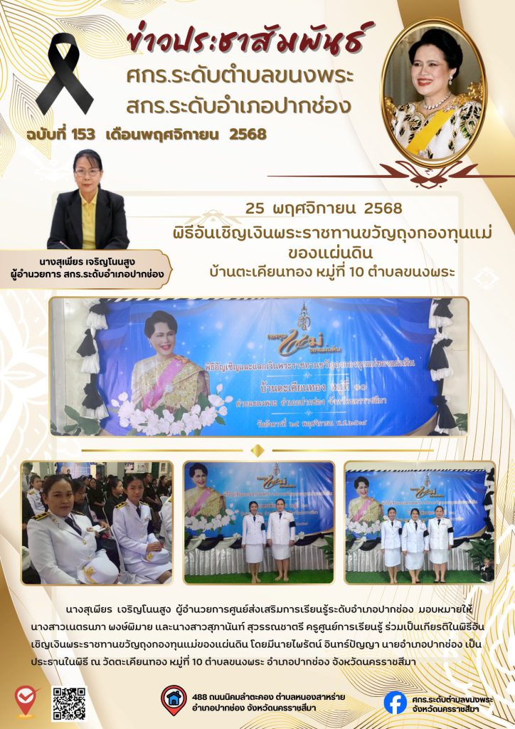 นางสุเพียร เจริญโนนสูง ผู้อำนวยการศูนย์ส่งเสริมการเรียนรู้ระดับอำเภอปากช่อง มอบหมายให้ นางสาวเนตรนภา พงษ์พิมาย และนางสาวสุภานันท์ สุวรรณชาตรี ครูศูนย์การเรียนรู้ ร่วมเป็นเกียรติในพิธีอันเชิญเงินพระราชทานขวัญถุงกองทุนแม่ของแผ่นดิน โดยมีนายไพรัตน์ อินทร์ปัญญา นายอำเภอปากช่อง เป็นประธาน ณ วัดตะเคียนทอง หมู่ที่ 10 ตำบลขนงพระ อำเภอปากช่อง จังหวัดนครราชสีมา