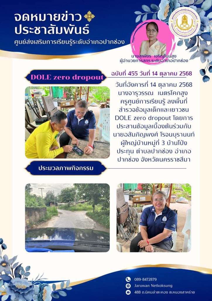 นางจารุวรรณ เนตรโคกสูง ครูศูนย์การเรียนรู้ ลงพื้นที่สำรวจข้อมูลเด็กและเยาวชน DOLE zero dropout โดยการประสานข้อมูลเบื้องต้นร่วมกับนายอสัมภิญพงศ์ โรจนบุรานนท์ ผู้ใหญ่บ้านหมู่ที่ 3 บ้านโป่งประทุน ตำบลปากช่อง อำเภอปากช่อง จังหวัดนครราชสีมา