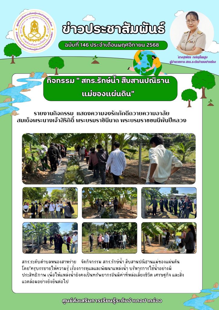 ศกร.ระดับตำบลหนองสาหร่าย จัดกิจกรรม สกร.รักษ์น้ำ สืบสานปณิธานแม่ของแผ่นดิน โดย”ครูบรรยายให้ความรู้ เรื่องการดูแลและพัฒนาแหล่งน้ำ บริหารการใช้น้ำอย่างมีประสิทธิภาพ เพื่อให้แหล่งน้ำยังคงเป็นทรัพยากรอันมีค่าที่หล่อเลี้ยงชีวิต เศรษฐกิจ และสิ่งแวดล้อมอย่างยั่งยืนต่อไป