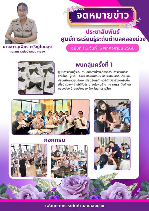 ศูนย์การเรียนรู้ระดับตำบลคลองม่วง ดำเนินการจัดกิจกรรมการเรียนการสอนให้กับผู้เรียน ระดับ ประถมศึกษา มัธยมศึกษาตอนต้น และมัธยมศึกษาตอนปลาย เรียนรู้การทำโบว์สีดำไว้อาลัยจากริบบิ้บ เพื่อนำไปแจกจ่ายให้กับประชาชนในหมู่บ้าน และ ศกร.ระดับดับตำบลคลองม่วง อำเภอปากช่อง จังหวัดนครราชสีมา
