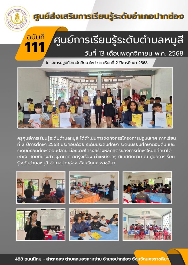 ครูศูนย์การเรียนรู้ระดับตำบลหมูสี ได้ดำเนินการจัดกิจกรรโครงการปฐมนิเทศ ภาคเรียนที่ 2 ปีการศึกษา 2568 ประกอบด้วย ระดับประถมศึกษา ระดับมัธยมศึกษาตอนต้น และระดับมัธยมศึกษาตอนปลาย มีอธิบายโครงสร้างหลักสูตรของการศึกษาให้นักศึกษาได้เข้าใจ โดยมีนางสาวจุฑามาศ ยศรุ่งเรือง ตำแหน่ง ครู นิเทศติดตาม ณ ศูนย์การเรียนรู้ระดับตำบลหมูสี อำเภอปากช่อง จังหวัดนครราชสีมา